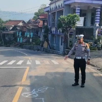Personel Satlantas Polres Sukabumi saat melakukan olah TKP kecelakaan lalu lintas di Jalan Raya Sukabumi-Palabuhanratu tepatnya di Kecamatan Bantargadung, Kabupaten Sukabumi, Jabar. ANRTARA/Aditya Rohman