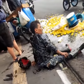 Alhasil, ia pun terjatuh dan tahu dagangannya tumpah ruah dijalanan.