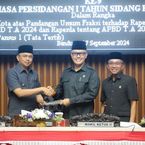 Penjabat Wali Kota Bandung A. Koswara menyampaikan jawaban resmi terhadap pandangan umum fraksi-fraksi DPRD Kota Bandung secara tertulis, dalam rapat paripurna yang digelar di DPRD Kota Bandung, Jalan Sukabumi, Jumat (27/9/2024).